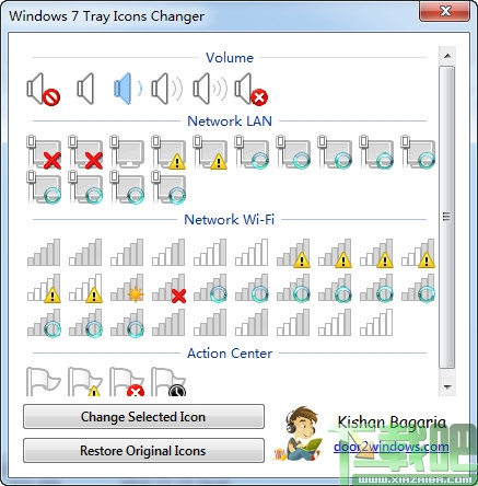 Windows 7 Tray Icons Changer能够替换windows7系统的托盘图标(网络连接,音量图标,操作中心,无线网络)。
