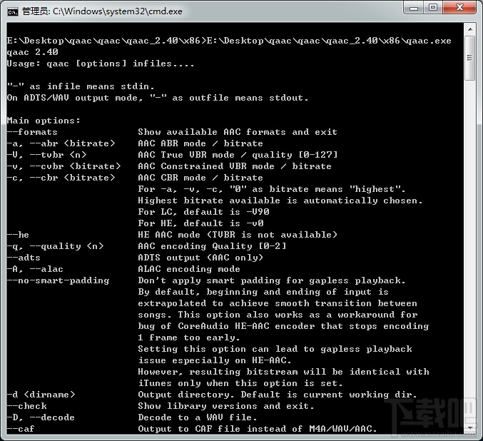 qaac一个是基于QuickTime API的AAC/ALAC命令行编码器。qaac.exe理论上据说和苹果的iTunes plus aac算法一样,能够转换为接近无损音质的有损音乐,在运行的时候是需要安装Apple Application Support以支持运行!