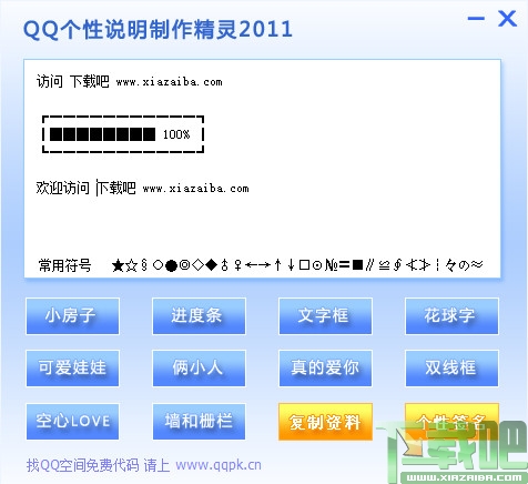QQ个性说明制作精灵(又称QQ个人资料)自带10余款由文字和符号组成的个性图案,方便大家加以修改后,设计成自己喜欢的图案样式,用于QQ个人说明中,向好友展示个性的QQ资料。