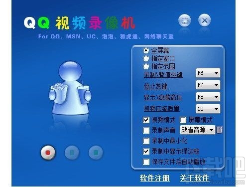 QQ视频录像机可以录制QQ聊天视频、MSN聊天视频、UC聊天视频、ICQ聊天视频、泡泡聊天视频、雅虎通聊天视频、网络视频聊天室、网络电视、电影片断、MTV录像、卡拉OK录像、个人视频、可视邮件、教程和课件及帮助手册使用的动画演示。