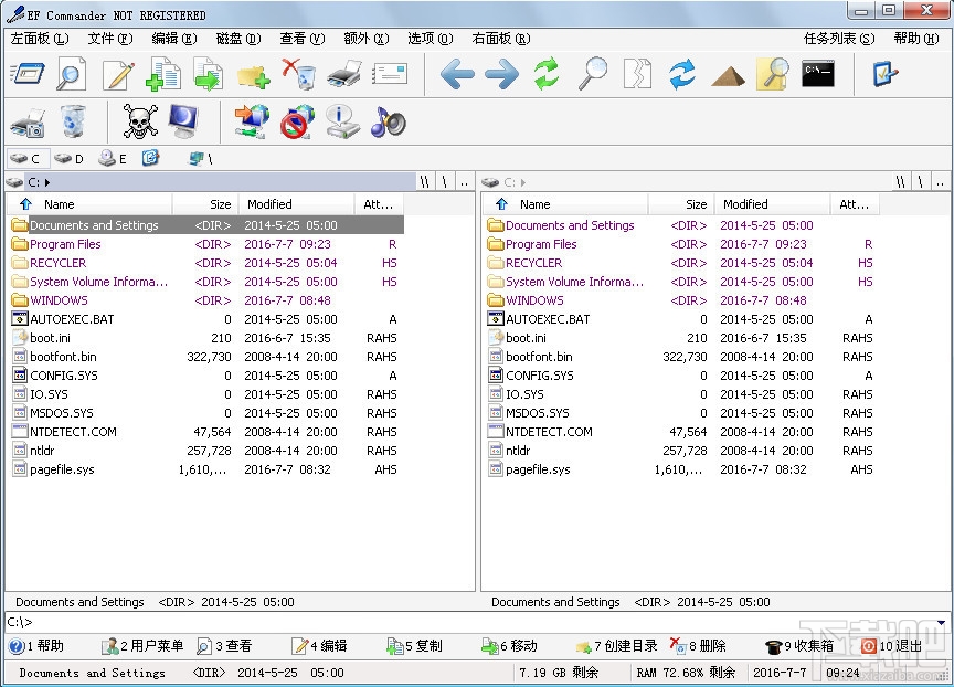 一款可以取代Windows资源管理器的工具。内建左右两个窗口,可以显示两个Disk Drive,利用鼠标拖曳即可很方便的将文件复制或移动到想放的目录中。具有快速观看 ZIP、ANI、AVI、BMP、CUR、DIB、EMF、GIF、HEX、ICO、JPEG、PCX、RLE、RTF、TXT、WAV等的功能。除一般的复制、删除、搬移、编辑.等功能外,也有压缩与解压缩及文件分割功能,也可改变操作界面的背景及颜色。该版本为EF Commander的多国语言免费版本,支持简体中文。