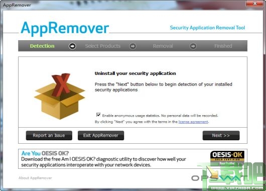 AppRemover是绿色软件,无须安装,使用方法也很简单,下载后双击运行,软件先搜索当前已安装的安全软件,点击Next,在列表中选择要删除的安全软件,Appremover将自动删除该安全软件。