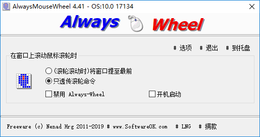 AlwaysMouseWheel一款鼠标窗口辅助工具。使用鼠标滚轮激活任何非活动窗口。解放使用过度的左键,只需移动到非活动窗口边缘,轻拨鼠标滚轮,即可激活为活动窗口。