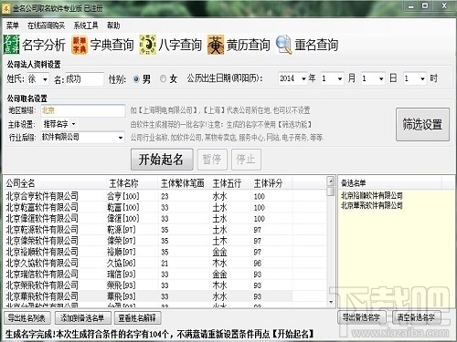 金名公司取名软件是一款功能强大的公司或店铺专业起名软件。 本软件的主要特点: 自动根据法人基本信息快速生成数万以上好名字。 自动根据五行匹配自动弥补搭配起名。 起名原理严格按照五格数理进行。 软件可以根五行,评分进行筛选名字。 软件有详细公司名称解释分析评分功能。 软件可以生成带二字名,三字名及四字名的公司名称,可以指定用什么字来生成名字。 使用本软件可快速为您的公司或店铺起个吉祥如意、生意兴隆的好名字。