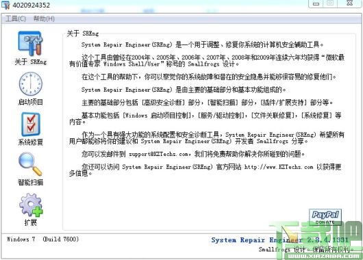 System Repair Engineer(SREng)是一款计算机安全诊断和系统维护辅助软件。主要用于发现、发掘潜在的系统故障和大多数由于计算机病毒造成的破坏,并提供一系列的修改建议和自动修复方法。 该软件是由 Smallfrogs 开发的,能够运行在所有主流的 Windows 操作系统上。