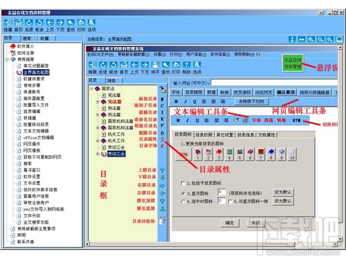 友益在线文档资料管理与授权软件是一款在线管理htm网页、mht单一网页、word文档、excel文档、幻灯片、wps文件、pdf、txt、rtf、GIF、JPG、ICO、TIF、BMP、PNG、DJVU、Flash动画等格式的文件。 数据保存在服务器上,你在家里,办公室,以及出差到外地,所管理的数据都能保存一致性,方便资料查询使用,可以进行阅读次数,复制级别,打印级别等授权,同时也非常方便数据更新与升级。存放在服务器上的数据进行了复合加密处理,只有权限用户才可以查看。该软件采用视窗风格,目录树结构管理,所见即所得的设计理念,同时在功能及设计上又具有独特的创新性,数据压缩存储算法,从而减少存储的空间。