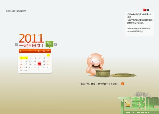 2010年很多人白过了,比如胡子猪……2011年你准备好了吗?不能再浑浑噩噩的过了,给自己定一个计划吧,看看胡子猪的2011年怎么定的计划。日历里边黄色底的是2011年的国家法定节假日的放假安排。