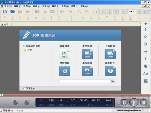 EOP简谱大师是一款永久免费的制作钢琴简谱的软件,我们人人钢琴网上提供的双手简谱绝大部分都是使用它来制作的。EOP简谱大师操作简单、上手容易、只要懂得简谱知识,熟悉10分钟即可自行制作双手简谱文件,制作出来的EOPN文件可以加载到EOP简谱跟我弹中,实现跟弹学习。
