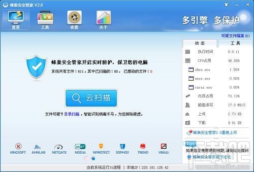 拥有16家国际著名杀毒引擎授权,全球高到病毒木马检出率的云安全软件。集成了(a-squared、AntiVir、Comodo、Ikarus、netgate、NOD32、nProtect、Quick Heal、Sophos、VBA32、卡巴斯基、江民杀毒、趋势科技、金山毒霸、麦克沃德等国际著名的十六款杀毒引擎的授权,拥有完善的云安全体系和全球高到病毒木马检出率是蜂巢安全管家2.0带给用户的较好体验。 新版的蜂巢安全管家2.0相比之前的版本也有所提升,首页增加动态功能,用户可以实时查看系统当前状态,该功能能够详细的记录执行时间、CPU占用、内存占用、磁盘读写以及上传下载项目,系统状态一目了然。 蜂巢安全管家定位安全辅助类软件,与其他杀毒软件能够同时安装使用,没有任何冲突,如此更为用户提供多一层的保护,安全屏障更加坚固。
