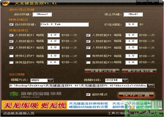 天龙键盘连按V1.41是简单百宝箱针对天龙八部2专用的一款键盘连按工具。它带有选择目标组合键,也是游戏选择目标的默认键,通过简单几个按键设置,即可实现自动选择目标、自动释放技能、自动使用物品等功能。