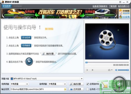 狸窝超级mp4格式转换器是一款功能强大的mp4格式转换器,狸窝mp4格式转换器可以将几乎所有流行的视频格式。如:RM、RMVB、VOB、DAT、VCD、DVD、 SVCD、ASF、MOV、QT、MPEG、WMV、MP4、FLV、MKV、3GP、DivX、XviD、AVI等视频文件转换为MP4机、智能手机、Apple iPod所支持的视频格式。