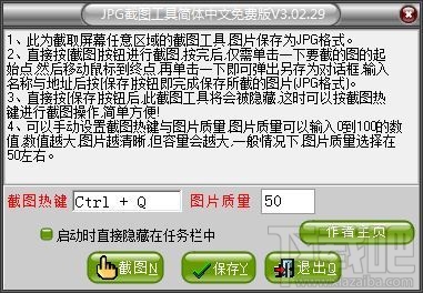 此为截取屏幕任意区域的截图工具,图片保存为JPG格式。直接按[截图]按钮进行截图,按完后,仅需单击一下要截的图的起始点,然后移动鼠标到终点,再单击一下即可弹出另存为对话框,输入名称与地址后按[保存]按钮即完成保存所截的图片(JPG格式)。直接按[保存]按钮后,此截图工具将会被隐藏,这时可以按截图热键进行截图操作,简单方便。可以手动设置截图热键与图片质量,图片质量可以输入0到100的数值,数值越大,图片越清晰,但容量会越大,一般情况下,图片质量选择在50左右。是一款完全绿色免费的软件。