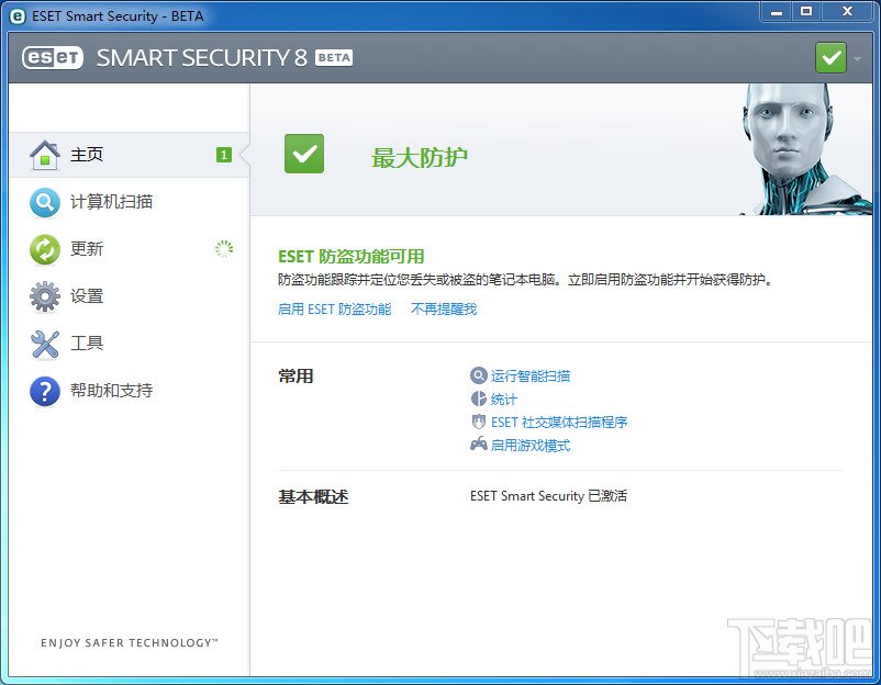 ESET Smart Security是一个集成的安全套装解决方案,适合普通个人消费者和中小型商业客户。它包含病毒防御与清除、反间谍软件、反垃圾邮件、防火墙等功能,而且不但杀毒迅速、精准,体积也非常轻巧,仅占用40MB硬盘空间。
