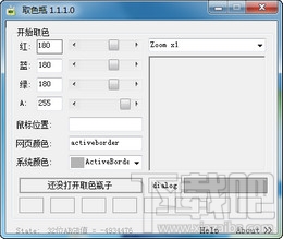 取色瓶可以获取鼠标坐标色,附带系统颜色选择,可根据RGB三个参数值调制颜色。有8个框框来保存颜色,程序退出不再保留颜色。如果您不知道使用,可点击Help按钮,观看简单功能演示。如果您有什么需要联系作者或需要更新版本,可点击About按钮。