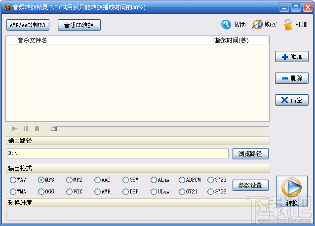 音频转换精灵是一款易操作功能强大的音频格式转换工具。音频转换精灵支持网上几乎所有音频格式,如MP2,MP3,AAC,AMR,WMA,OGG,WAV(PCM,DSP,GSM,ADPCM),G721,G723,G726,VOX,ALAW,ULAW等常见的音频格式间的转换,并支持抓取CD光盘中的音乐文件转换为MP3,WAV,WMA和OGG格式文件,同时可以设置音频参数,如音频采样率、音频品质等,来控制输出文件大小和音质清晰度。音频转换精灵采用先进的编解码技术,转换速度快,音质效果好,可以批量转换,并且内置播放器支持多种格式的播放功能。