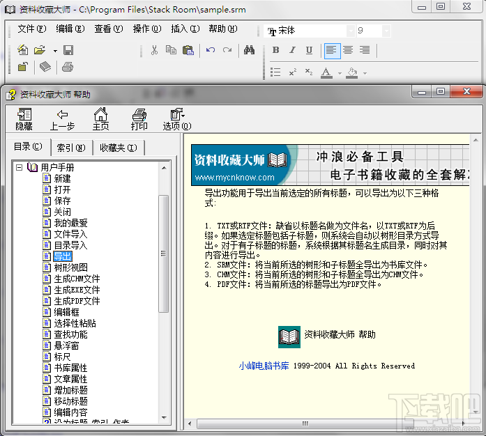 资料收藏大师是你的好助手,她专门是为帮你更有效率的搜集、管理、阅读和查找你的机器或是从网上下载的资料和代码而设计的。 她有一个悬浮窗,你可以选择你需要的资料拖拉进悬浮窗,她自动会选择第一句话作为这段文本的标题,并将其 保存下载。她现在已经支持IE的的html内容保存了,不光是 html内容,还有图片,flash等都能一起保存下来。 她还可监视剪贴板。同时悬浮窗还可接受文本文件的拖拉, 这个功能相当于文件导入。资料收藏大师支持导入Txt、Rtf、 Doc、Htm、Mht、Eml、Doc、Swf、Gif、Jpg和Srm 文件等大量格式。 她还支持附件,当你的文章附带一些源码或图片,你可以将它们作为附件来加到文章的后面。她还可将书库文件保 存成为一个Chm,Pdf 或Exe文件,这样你的书库也可以和机器上没有资料收藏大师的朋友一起共享了。