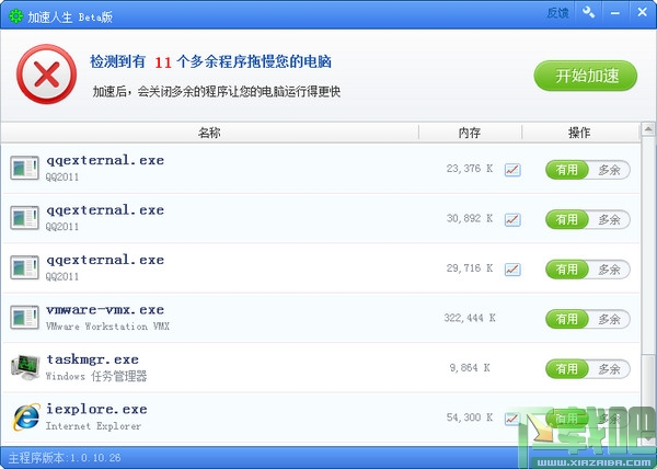加速人生是一款方便小巧的系统进程优化工具,能够为软件用户一键清理优化系统多余进程,减少进程网络、CPU和内存占用,加速人生让电脑在上网、游戏、视频、处理文件时有更多的带宽和空间,以提高电脑的运行速度。