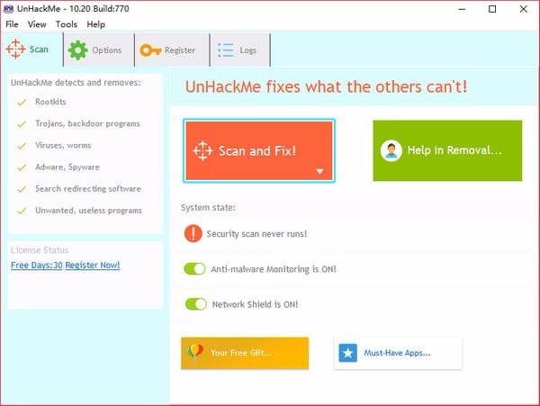 UnHackMe 是一款专门帮助你防范和杀灭木马病毒的软件,rootkit是黑客用来掩盖入侵并获得对计算机或计算机网络的管理员级别访问的程序,UnHackMe 可以有效查杀rootkit病毒,保证计算机安全。UnHackMe是一款专门设计用来检测和清除Rootkits(一个木马程序的新的一代- 隐形木马)。Rootkit是一种程序,黑客用来掩盖入侵并获得管理员级别来访问计算机或计算机网络。入侵者安装上后使用操作计算机或利用已知的漏洞或和谐密码的rootkit。 rootkit的安装一个后门让黑客对计算机完全控制。它隐藏自己的文件,注册表项和进程名称,并从你的眼睛的网络连接。您的防病毒软件无法检测这种程序,因为他们使用的文件压缩和加密。UnHackMe允许您检测和删除的rootkit。 UnHackMe检测所有现代的rootkit,并清除Rustock,Haxdoor,Hacktool,精英键盘记录等恶意软件。