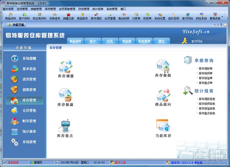 26.73 MB/2020-08-17易特服装店收银软件是一款优秀专业的专门针对服装店,内衣,鞋帽店而设计的销售管理软件,是一款具备有市场潜力的服装销售软件,结构明晰,操作简单,对店铺商品的进销存能很好地管理,让你的经营帐目清清楚楚。独创的颜色尺码处理技术,可以轻松应对各种颜色尺码。易特服装店收银软件功能简介:一、基本功能:自定义换肤、进货入库、销售收银、进货退回、盘点、付款、预付、收入、支出、成本、利润核算等。二、增强功能:会员管
