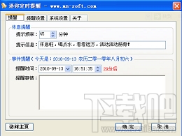 迷你定时提醒工具是由迷你软件免费提供的一款绿色软件工具.适用于长时间在电脑前工作的用户,坚持使用,可有效避免长期使用电脑引发的各种疾病。