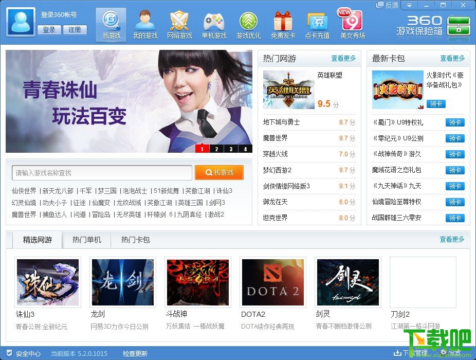 360游戏保险箱是一款针对网游用户提供专业防盗的软件,所含主动防御技术,对网游中出现的盗号木马进行聊天及网银等的侵入,保证了电脑的安全游戏环境。360游戏保险箱还增加了游戏极速安全启动功能,加快了网游的运行速度,既安全又流畅。公会还能入驻游戏保险箱,进行招募会员,还能领取游戏礼包、游戏激活码等等。
