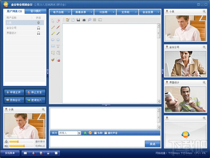 网络视频会议,是指两个或两个以上不同地方的个人或群体,通过传输线路及多媒体设备,将声音、影像及文件资料互相传送,达到即时且互动的沟通,以完成会议目的之系统设备。金谷网络视频会议是由北京金谷视通科技有限公司推出一套多人网络视频会议系统