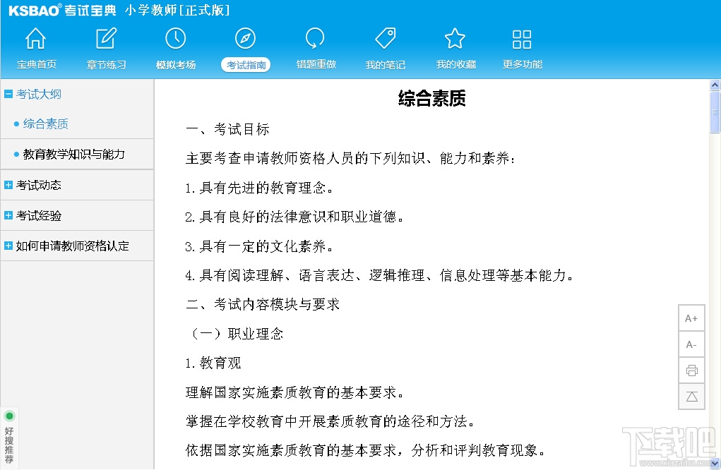 小学教师资格考试宝典一款由英腾软件公司开发软件,适用小学教师资格考试。软件内含题量丰富,功能简单实用。针对重点难点详细的解题思路,让使用软件的考生能快速掌握难题。英腾软件作为行业的领跑者,与多个级别高资格考试权威机构保有密切的合作关系,保证选题具有权威性! 模拟考场 模拟考场是一项自由出卷功能,用户可用它选择指定的科目、题型以及题目的数量与相应分值,组合成一份试卷。这项功能可以满足用户随时自测,任意出卷的需求! 历年真题 正所谓万变不离其宗,往年考题总是考试前学习、借鉴的重要资料!《考试宝典》题库内收录了最全的历年考试真题,同时还配有专业的权威讲解,将重要知识点一一列举于内。 试题查找 试题查找是《考试宝典》推出的又一项特色功能,它可以以某个关键词为索引进行查找,然后将包含此知识点的所有试题汇总显示,并标明题型与来源,更科学的为考生节约时间。 错题重做 日三省吾身!记录每道错题,就如记录自己的每个弱点一般,每天将其调出重做,反复加深对正确思路印象,达到做一题会一题的效果。 我的收藏 帮助用户将收藏的题目按照科目、章节、题型、时间分类,针对性强,覆盖了应考的全部知识点,可根据需要显示答案或隐藏答案,测试完毕给出答题正确率。 三版合一:手机、网页、PC三位一体,同步更新。让您随时随地学习。 考试宝典单机版升级为新考试宝典宽屏版,电脑、网页、手机三平台数据互通,一个账户和充值码可以实现多平台使用,所有科目整合到一个软件,让考生更方便!
