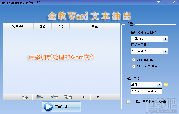 本程序支持的Word版本: Microsoft Word Ver.7(95)/Ver.6 Microsoft Word 2003 Microsoft Word 2003 Microsoft Word XP Microsoft Word 2001 for Mac Microsoft Word 2007 Microsoft Word 2010 可以从上述文件的各种编码字符集数据中抽取文本。 本程序支持的可转换的字符集: EUC-JP EUC-JP-FIX ISO-10646-UCS-2 ISO-10646-UCS-4 ISO-2023-JP ISO-8859-1 Shift_JIS UTF-16 UTF-8、WINDOWS31J ChineseGBK ChineseBIG5 GB18030 KoreanKSC Shift_JIS-2004 ISO-2023-JP-2004 EUC-JIS-2004 本程序支持的可抽出的字符串: Unicode字符集 日语 英语(只限于拉丁字母字符集ISO_8859-1) 汉语(简体字 GB18030、GBK、繁体字Big5) 韩语(KS_C_5601_1987)的字符串 使用上述语言外的字体时,无法保证抽出结果的正确性。 抽出后的文本有17种字符编码集可供选择。抽出后文本的编码方式所使用的基本字符集中所没有的字符,转换为类似的字符(1个字符或1个字符的组合)。当没有类似的字符时替换为"〓"(2个字节)、"?" (1个字节)。 无法从有密码保护的文件中抽出文本。有密码保护的文件必须事先在源程序中解除安全设置。 金软Word文本抽出工具还具有快速、稳定、安全的特点,其操作方便,简单;界面清爽,灵动。它是Word的一个辅助软件,其操作方便简单。 二.功能介绍 1. 支持17种常见可转换字符集 2. 支持5中常见的语言 3.支持在输出文件名末尾加文件生成日期后缀 4. 支持批量处理,操作简便,节省您的时间