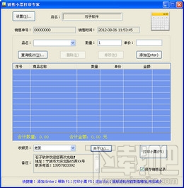 这是一款支持POS58热敏打印机,实现打印销售小票的软件,软件简洁且实用!主要特点:1、自动日期和销售票号;2、自动合计数量和金额;3、记忆商品名称并关联单价;4、可对小票记录进行查询统计。