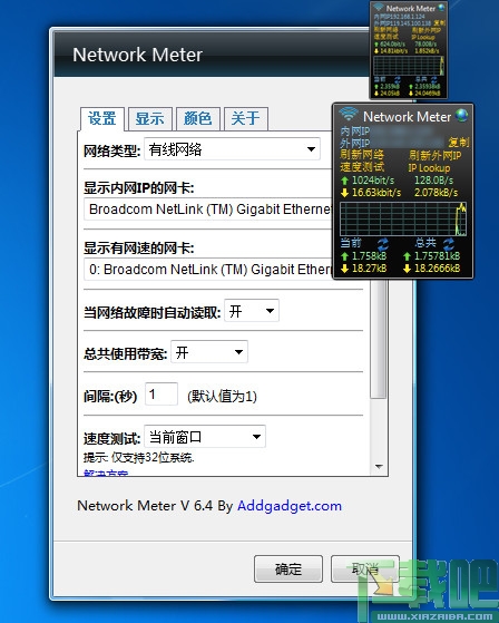 Network Meter可以监控有线和无线网卡的流量,并用数字或条形显示,非常实用。Network Meter是侧边栏工具,所以只支持Vista和Win7。该工具默认是监视有线网卡的,需要到设置里选择监视的网络类型和网卡。正常使用时如选择关闭,所有设置会丢失;但关机或重启则不会,原版即使如此。