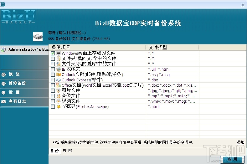 二、何为BizU数据宝? Bizbackup即BizU 数据宝(简称:BizU)采用先进的CDP(持续数据保护)技术,它是对传统数据备份技术的一次革命性的重大突破,它会不断监测关键数据的变化,并不断地自动实现数据的保护,从而致力于为中小企业和个人提供文档数据安全备份服务。让用户在充分享受快速、实时、自动数据备份的同时提升数据的安全性。 BizU的优势: 1、国内先进的 Office 文档备份产品,支持各种类型文档的备份; 2、CDP 备份技术,自动实时备份; 3、自动检测备份链接,无需时刻连接设备; 4、备份数据 AES-256 加密保护; 5、密码保护,备份数据只能由用户自己管理; 6、傻瓜式设计,无须专业人员操作,简单易用; 7、灵活支持多种外接设备:U盘、SD卡、移动硬盘、PC机、服务器。