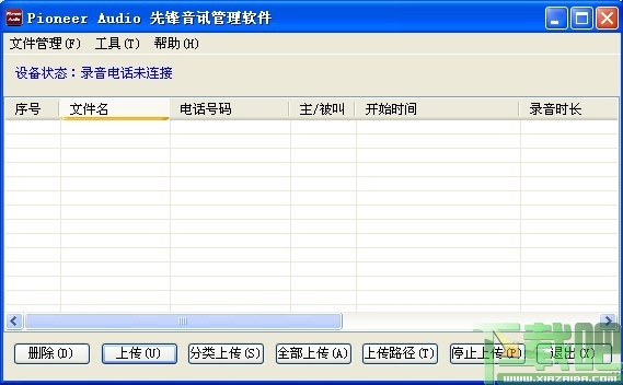 先锋录音电话机带有全速USB 2.0接口,通过此接口,可以同PC机互连。在PC机上运行录音管理软件,运行软件后,在软件窗口可以看到本机录制的所有语音,选择一个或多个语音,按“上传”键,语音以WAV格式被上传到PC机并保存,无需录音电话支持,用户在电脑上就可以播放上传的语音文件。语音文件也可以作为一个通常的WINDOWS 文件,被复制、删除和E-MAIL等。USB接口主要功能如下: