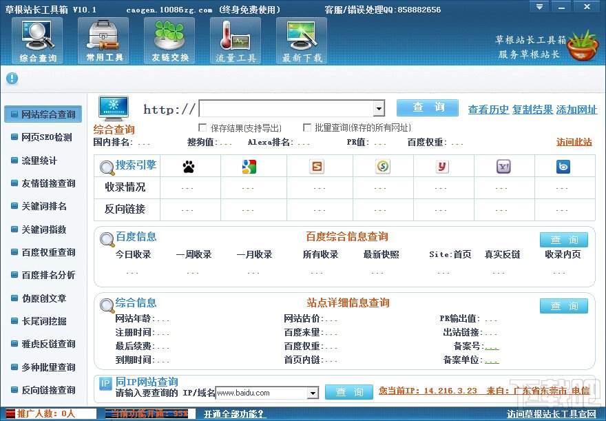 草根站长工具箱是一款为了方便国内站长查询网站信息的软件,草根站长工具箱基本集合了站长平时用到的所有工具,综合查询:包括收录查询,关键字排名,友情链接检测,网站年龄,网站价格评估,网站备案查询等等,常用工具:包括历史收录,页面模拟抓取,密度查询,各种加密,ICO在线制作,LOGO在线制作,多功能计数器,各国语言翻译等,增加外链:免费在线快速提高网站暴光率,明显增加网站外部连接(不作弊)。快速提高百度,YAHOO,GOOGLE等排名,网页刷新工具:又名网页刷新器,这个小工具主要功能是刷网站PV浏览量,适合刷淘宝/拍拍等浏览量。