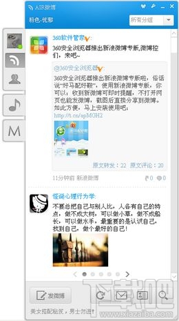 AIR微博是基于Adobe AIR,并通过新浪微博API接口,开发的微博客户端,支持在Windows、MAC、Linux下运行。 界面简洁,微博浏览更流畅:简约至上,用简约的设计满足最直接的需求,不断完善用户体验,打造最易用的微博客户端。 音乐、视频,精彩微博轻松发布:独立窗口发微博,支持表情、图片、话题、富媒体发布,支持拖曳及复制发图片。 多种新消息实时提醒,随心开启:可以通过设置开启各类消息提示,包括新微博、新@、新评论、新私信等。