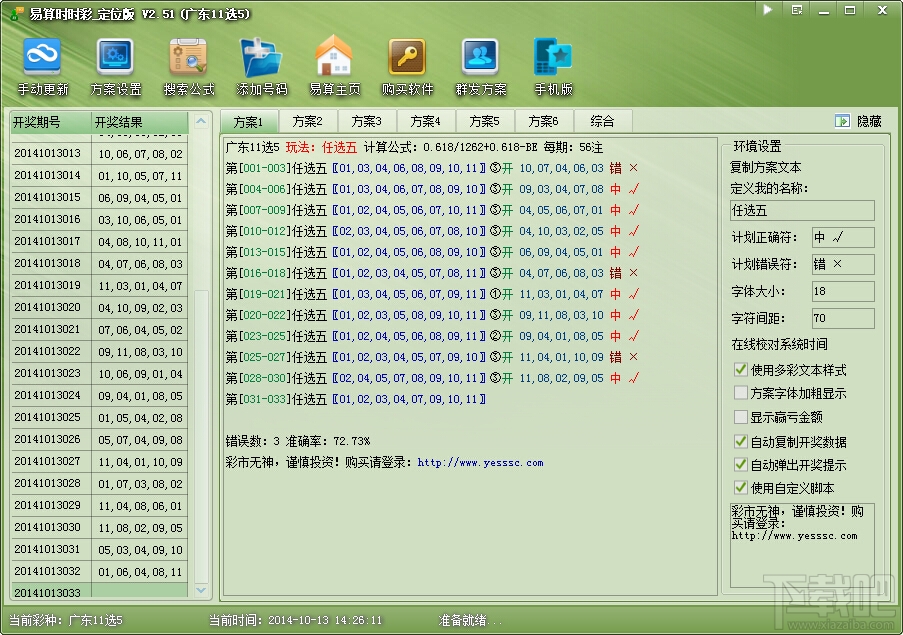 《易算11选5之任选计划》是一款专门用于江西11选5以及广东11选5福利彩票的任选计划软件,包含的玩法有:任选二,任选三、任选四、任选五、任选六、任选七、任选八等,本软件界面简洁、使用方便、命中率高,是同类软件中的姣娇者。软件自动更新奖号且比其它软件快,自由设置计划期数和码数,自带倍投计算器,可手动输入倍数或指定利润百分比后自动分配倍数。软件内置数千公式,验证后自动排序放入6个方案,并可自己编辑公式进行验证,自由灵活。