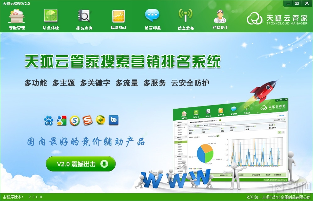 天狐云管家是一键式桌面系统管理,直观查看网站维护情况和排名查询、询盘查询以及流量监控等功能,为客户网络营销提供全程监管,捍卫客户网络利益。