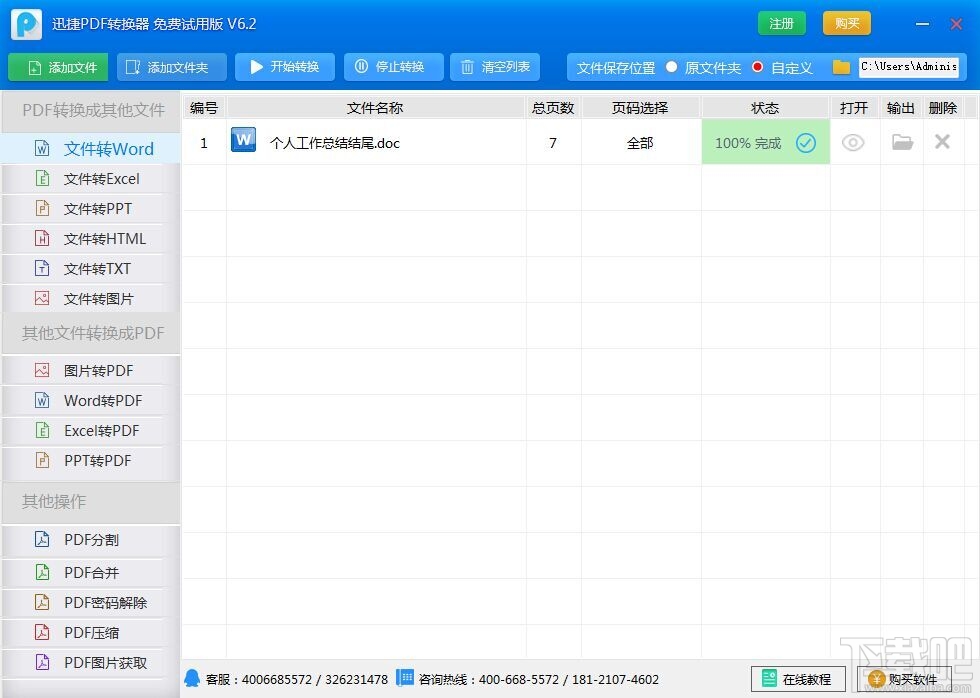 pdf转换成word转换器,使用本软件可以把pdf文档轻松地转换为word文件,方便编辑使用。 本软件支持把含有文字、表格、图文混排、字体格式的pdf文档转换为word文件,转换后的word文档可任意编辑修改。对于加密后的pdf文档,提供相应的密码后,也可使用迅捷pdf转换成word转换器进行转换。 本软件不依赖于Adobe Acrobat,Acrobat Reader pdf组件,但要求电脑需要安装ms office或wps等组件才可正常使用。 如果你使用本软件后觉得好用,欢迎推荐给你的朋友,让更多的用户了解到pdf转换成word软件的实用性。