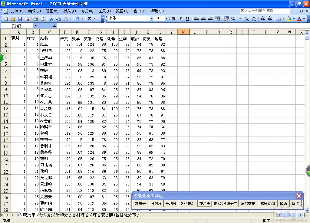 EXCEL成绩分析系统是一个学校、一个年级、一个班必备的小小软件,操作简便,所见即所得,多科多班多功能。使用时,只需将已有的成绩单直接粘贴入软件中,点相应按钮即可完成:(1)求总分,(2)求各科参考人数、平均分及排名、各分数段人数、及格人数、及格率、优生人数、优生率、差生人数、差生率等,(3)求各科前X名学生名单,(4)年级前X名的各班分布,(5)学号顺序不变的各科成绩排名。(6)成绩查询。软件由于没有人数及班数限制,软件也适合教育局、教研室使用。软件永久免费!全面支持Windows 各个操作系统。