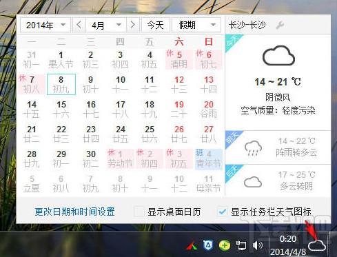 搜狗壁纸任务栏天气日历工具是提取自搜狗壁纸 2.3版的新功能,可以显示任务栏万年历,支持显示农历和节假日,支持天气预报。 体积轻巧,非常实用,为了方便,编译单文件,不占系统资源,不影响电脑速度!