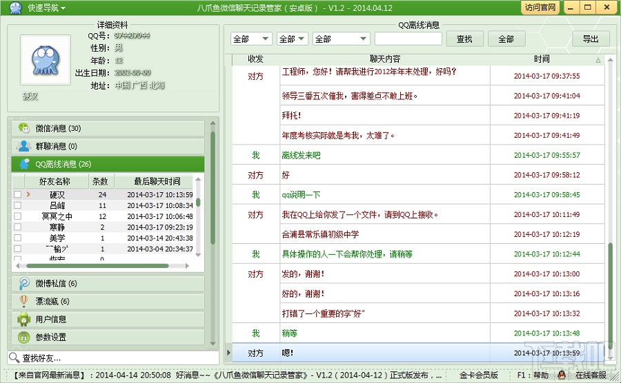 “八爪鱼微信聊天记录管家(安卓版)”是一款针对安卓手机微信的数据快速备份与导出、浏览好友聊天信息(文字、语音和图片)、聊天信息导出等多功能的手机工具软件。涵盖了手机微信的微信消息、群聊消息、QQ离线消息、微博私信、漂流瓶、用户个人信息等全方位的功能,能让用户摆脱在4英寸的手机屏幕上一条一条翻阅过往聊天信息的烦恼。
