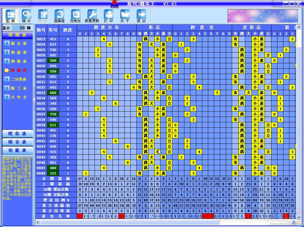 《排列3概率王》是体彩排列3具备特色的软件,充分体现了所见即所得的特点。它是由数位精通彩票的数学专家耗时几年完成的,参考了上百种彩票软件,听取了数万彩民的意见,吸收了其优点,排除了不足,可谓集大成的软件。特别是统计数字与图表的完美结合,使你一眼就可以看出大的走势。抛弃了许多根本错误的概念(如位积和、容错、中复隔等),把每一个类型进行了细致的划分,从而使选号成为一种享受。界面美观大方,布局合理,操作简单。你会体验到:使用概率王等于省钱,使用概率王就是赚钱。这是终结买彩不中的优秀选择 !