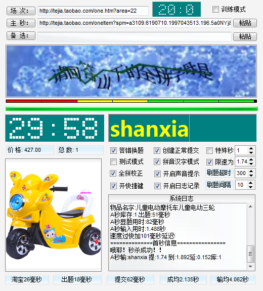 软件主要功能简介 : 1 :极限加速,出题快,显题快,提交快。 2 :高频词自定义一键提交,自定义纠错模式。 3 :全拼/首拼/汉字任意一键切换提交,打首拼按逗号提交全拼 打全拼按分号提交首拼,自动双回车,省去一个回车200毫秒 。 4 : 五笔模式打汉字,按回车提交汉字,按逗号提交全拼,按句号 提交首拼 。 5 : 自带账号管理,N账号任意切换,自动记录成功记录,秒杀 成功自动截图保存到秒杀成就目录 。 6 : 自带训练模式,CPU毫秒级精准计时,快速提升秒杀速度 。