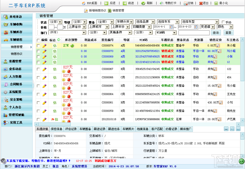多级别多职务权限管理 车管家ERP二手车软件实现操作种类、权限级别、员工职务的多维综合权限管理。操作种类权限管理,例如规定业务员只能查看和增加自己车源,不能修改和删除车源;多级别权限管理,例如规定业务员只能查看自己的车源,或者可以查看本部车源;多职务管理,可以指定员工为普通业务体验还是门店经理等等。
