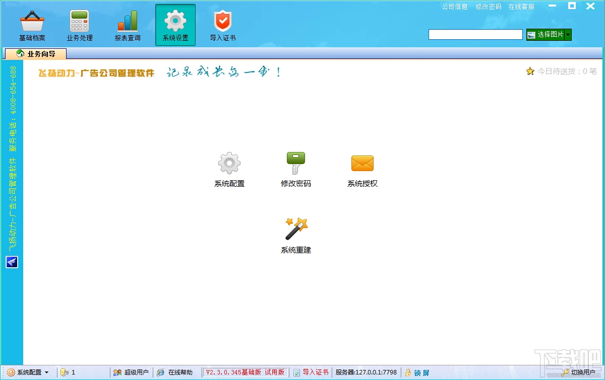 飞扬动力广告制作管理软件是由成都飞扬动力软件有限公司自主研发的面向广告制作行业的经营管理软件,目前广泛应用于喷绘、写真、条幅、雕刻、吸塑、图文印刷、LED电子屏等多个领域。它能迅速帮助广告制作企业建立起整套信息化管理流程,着重解决快速制单、客户跟踪管理、账款管理、图片管理等广告制作领域中常见的管理难题。软件操作简单,即看即懂,不需具备专业电脑知识。比传统的电子表格记账更加智能化,并具有安全、查询方便、可以远程联机等诸多优点,是广告制作企业提升管理水平新一代的解决方案。