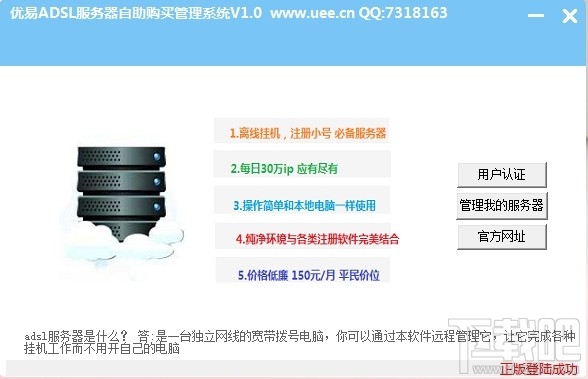 软件简介 优易adsl服务器是优易软件公司独家推出的一款服务器,服务器采用纯净的操作系统可以屏蔽安全控件的检测适合特殊用户的需求使用,优易服务器24小时运行机房配置了不间断电源从而有效防止数据的丢失。同时优易adsl服务器拥有独立的带宽每日30万IP数据可拨号切换并不会断掉远程控制。其次用户可通过软件远程对服务器进行时时控制, 软件功能 1.离线挂机,注册小号必备服务器 2.每日30万IP数据,支持不离线ADSL拨号换IP 3.纯净环境与各类注册软件完美结合 4.通过软件远程对服务器进行时时控制