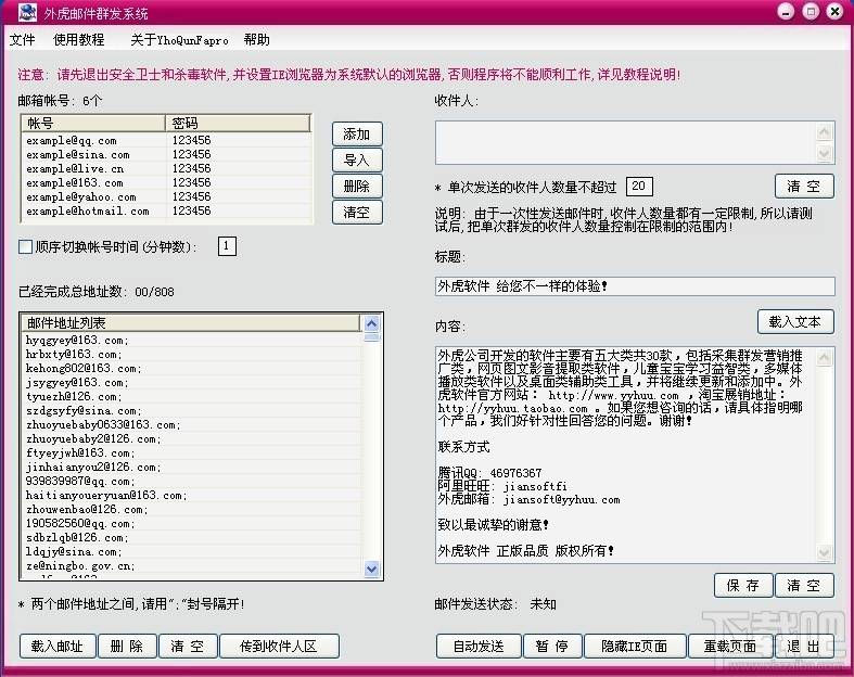 邮件营销-无成本的营销方式, 让外虎邮件群发系统帮助您! 也许您正遇到这样的问题,希望快速推广自己的网站或是发布自己的作品或其他的业务信息,却没有合适的广告途径。 传统媒体广告投资极高,往往花费大量时间和精力却又得不偿失。现在有一种简单的方法可以帮助你快速实现业务推广或发布信息的目的,就是发送大批量广告邮件。 由于广告邮件业务是点对点的与大量最终客户接触,打破传统媒体在发布地域、发布时间的限制,相比之下,我们的广告传播范围极其广泛的。可以按照受众的具体公司、地理位置、国家等进行精确定向,所以它的广告效果是非常好的。 发送Email广告,将您的信息直接发送到对方的邮箱里,而您只需坐在电脑前,接受网上的咨询与合同。真可谓成本极低,广告覆盖面积极大,收效甚广,已成为时下个人及企业进行营销传播的新策略。 外虎邮件群发系统YhoQunFapro具有很强大邮件群发能力,软件界面简单实用, 一目了然, 不用注册太多的邮箱, 通过它,以一对一的发送方式, 速度快而且不入垃圾箱。