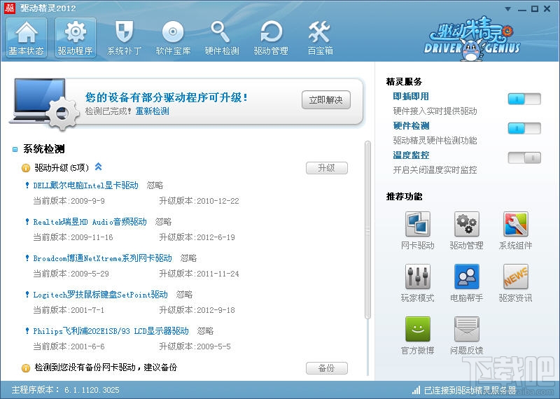 驱动精灵是一款集驱动管理和硬件检测于一体的、专业级的驱动管理和维护工具。驱动精灵为用户提供驱动备份、恢复、安装、删除、在线更新等实用功能,也是大家日常生活中经常用到的实用型软件之一了。
