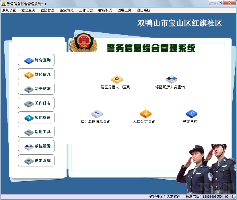 一警务信息综合管理系统软件特点及适用范围 本系统适用于公安局派出所、警务室、街道办、居委会、社区、乡镇、村委会、企事业单位等需要对辖区的常住人口、流动人口、寄住人口、工作对象、重点人口等以及辖区房屋、经营场所、居民财产、宠物等进行管理的单位。其比较大特点就是简单适用、功能强大。用户无需具备很高的电脑知识,简单指点就可熟练使用本系统。信息采集除非必须键盘输入,全部实现智能导入、鼠标点选录入,比较大程度的提高了工作效率。