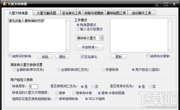火星文转换器功能简介: 1、火星文转换器 支持实时转换、签名美化、全面转换、快速转换、用户自定义转换。 2、输入法外挂模式 支持打字简体自动转火星文、简体转繁体、简体转异体、繁体转简体。 3、火星文翻译器 支持词汇优先、单字优先、仅词汇翻译。 4、签名美化工具 支持随机和固定两种方式设计个性签名,支持自定义特殊符号密度。 5、拼音与笔画数