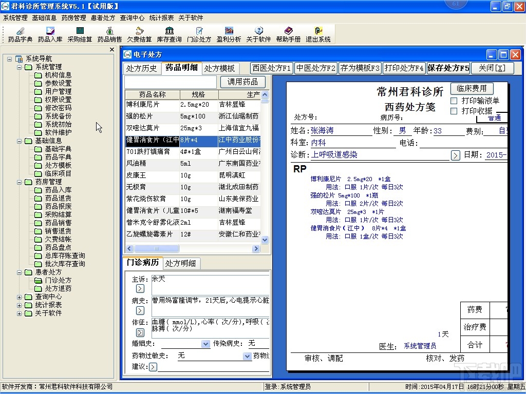 ★ 就诊模块:就诊模块结构清晰,傻瓜化操作。调用药品可以按拼音、汉字进行查询,开处方时可以调用历史就诊模板和处方模板,大大提高了开处方、和门诊病历的速度。作为医生时间久了就记不住历史病人的就诊过程了,君科软件可以随时调用历史病人的就诊病历和处方,随时了解就诊过程,不至于尴尬,能动态的观察病人,有效的防止误诊。写病历--开处方--划药价--打印处方和收据--打印输液单--保存整个流程一气呵成简单易用。君科处方管理还具有强大的输液单自动生成功能,不需要手工输入输液单,系统会根据开处方情况自动判断输液单进行打印。